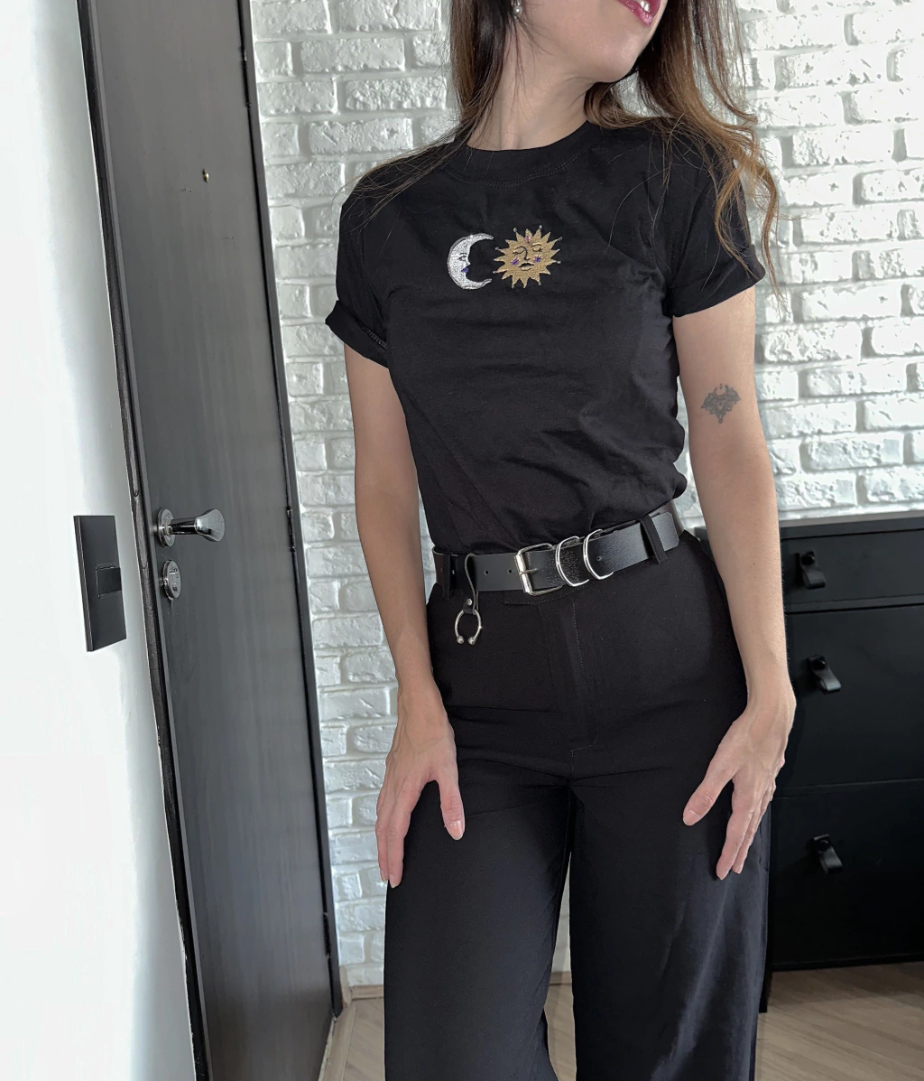 Com base preta e tecido de algodão premium, ela carrega um bordado exclusivo que une a força do sol e a sensibilidade da lua. O trabalho combina bordado à máquina com aplicações feitas à mão em vidrilhos e strass — criando uma peça que vai além da moda: transmite significado e presença.